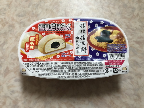 あんま 雪見だいふく って食べないので逆に 桔梗信玄餅コラボは初めてだっけ?って感じだけど・・・・・・雪見だいふく史上 最強のおいしさでは?とか噂されるほどとかでコンビニで見かけて買ってみたけどやっぱ、なんていっても、中の黒蜜がおいしいって感じかな雪見だいふくも外側やわらかいし桔梗信玄餅もやわらかくて食感も似てるのもいいかも黒蜜のおいしさはわかりやすいけどなんかきな粉アイスは冷たさで味覚が鈍ってのことか少しきな粉風味が弱いような気がするけど・・・・・・なんか、顔みたいに見えるかもフォークが桔梗信玄餅だし色がこんなんだから竹なのかって思ったけどいつも通りプラスチックなんだなぁ実際、このフォークって別に使いやすいことないからこのご時世、フォーク廃止してもいいような気がするけど