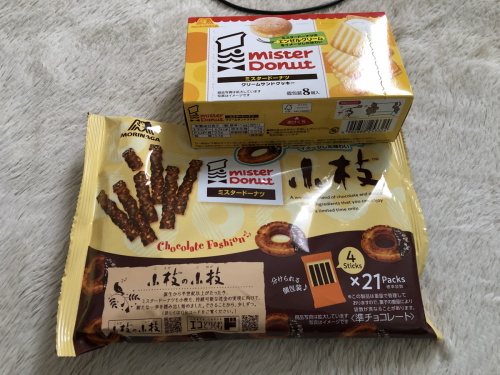 森永製菓 ミスドのクリームサンドと小枝時々、ミスドなのって見かけるけどこの春の森永はエンゼルクリームをイメージしたクリームサンドとチョコファッションをイメージした小枝とあとチョコボールもあるみたい今日はクリームサンドと小枝を食べてみましたクリームサンドも小枝もパッケージを見れば、なんとなくそうかな・・・・かすかにそんな感じはするけどなにもミスドコラボと知らずに食べれば判りにくいけど・・・・('◇')ゞでも、どちらもそれなりにおいしいのでクリームサンド8個という内容量はあっというまに食べちゃった小枝のほうはチョコに混ぜてあるもののおかげで普通のチョコよりさらにおいしい感じでもそのせいかなぁ21個入りで3分の1を残して少し飽きてきちゃった(;'∀')一気に全部は食べられなかったですクリームサンド 5点中 3.6点?小枝 5点中 3.8点?