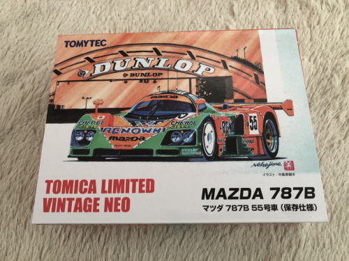 昨年の10月に注文していたMAZDA 787Bが今日届いたこんなパッケージルマン優勝記念の55車なので背景のダンロップのタイヤはサルトサーキットのダンロップコーナーかなわざわざ、保存仕様って書いてある