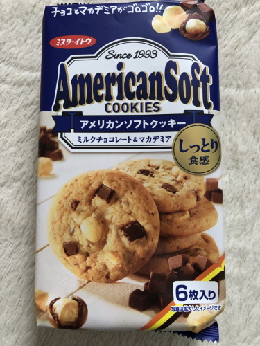 イトウ製菓 アメリカンソフトクッキー マカデミア21年3月から発売のシリーズどおりであまり見かけなかったような感じ('◇')ゞパッケージの上部に書いてある通りでチョコとマカデミアナッツが大きくてナッツ自体をかじった時の食感がしっかりと楽しめてマカデミアナッツの味が口の中に広がるのがいい感じミルクチョコとナットの香りがしっかりとわかるのもいいしソフトな食感もあってる内容量6枚はおいしすぎて足りな~い9枚とか12枚とかにしてほしいくらいさすが ミスターイトウ5点中 4.0点