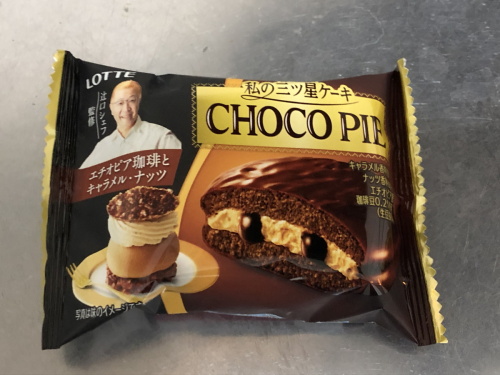 ロッテ チョコパイ 辻口シェフ監修 私の三ツ星ケーキチョコと、キャラメル綱領、ナッツ香料、エチオピア珈琲豆、と洋酒って、こんなにいろいろ混ざって風味が豊って感じ特に洋酒がいい5点中 3.8点