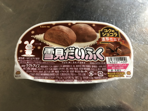 ロッテ 雪見だいふく コクのショコラ濃厚仕立てチョコたっぷりなまっちゃいろだいふく外側の求肥も中のアイスもたっぷりチョコが混ぜてあるのでしっかりとカカオの感じがしてなかなかおいしい5点中 3.8点