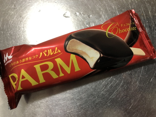 森永製菓 パルム チョコレートこのアイスはたぶん多くの人がおいしいっていうかなぁってねっとりとした食感がいい感じでチョコが濃いって感じだしなかのバニラアイスも来いって感じ5点中 3.8点かなアーモンドとピスタチオを食べてみないとなぁ