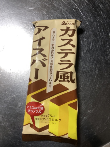 赤城乳業 カステラ風アイスバー寒くなってきたのに風呂上がりに食べようとスーパーでアイス見てたら面白い飲みつけて取り出してみるといがいな小ささ最近の値上がりでずいぶんケチってるのかなと思ったけどパッケージを見ると実際のカステラ一切れ分のサイズをイメージしてるって。。。。すっごいうまいやり方('◇')ゞアイスの先のほうにはザラメが混ざっていてちゃんと食べたとkに食感があるちょと普通のアイスとは違ってやっぱカステラの食感を思い出す感じで確かに、なんかカステラをアイスにしたらこんな感じかもって気がするカラメルのような甘い味もいい感じ化も5点中 3.7点