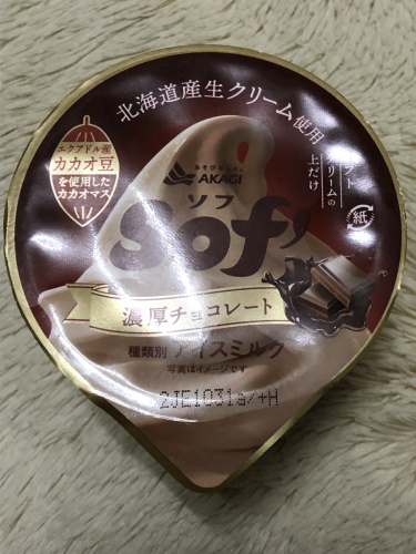 赤城 ソフ 濃厚チョコレートなんとなく選んだアイスソフというなまえからも見た目からもソフトクリームタイプの頭だけみたいなかんじ食感が普通のカップアイスよりちょっとふんわりな感じチョコもすこしカカオ濃いめでしっかりとしたチョコの味でそれなりにいい感じおいしいのでもうちょっと食べたいかなって5点中 3。7点かな