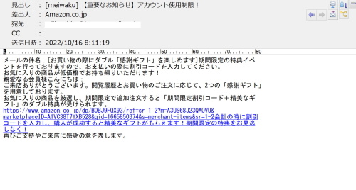 Amazonのふりした詐欺メールだというのはわかるけど件名が 【重要なお知らせ】アカウント使用制限!となってるし文面の体裁がなってないし差出のアドレスはarnazon-co-jp@jdbceuu.cn迷惑メールにはよくある中国のドメインだし件名が使用制限とかなってるのにサングラスを売ってるページのリンクって!?でも リンクの頭はちゃんとしたアマゾンのアドレスだからクリックしてみたらサングラスを売ってるページだった?????それってどういうことなにがしたいんだろう?そのサングラス売ってるショップが怪しいってことかなぁまあ、よくわからんメールのリンクは開かないほうがいいだろうけど・・・・・