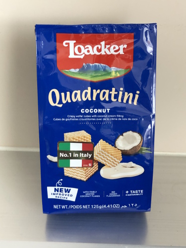 ロアカー クワドラティーニ ココナッツ今日はこれこれも、開けると結構なココナッツのいい香りがしてそれだけでおいしそうって感じ食べた時の風味もちょうどよい感じでくどくもなくて次から次へと食べたくなっちゃう感じサクサクの食感とココナッツの風味でこれもおいしかった★★★★☆