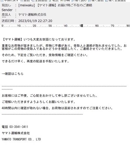 普段からよく見て覚えておけばわかると思うけどそうじゃなければ、本物と見間違えそうなクロネコヤマトのスパムメールよく見ると受取人と連絡が取れませんでしたって、ことで届いたメールだけどいや、どっちがどっちだよ受取人はこっちのことか?って感じで、そこを疑問に思えば怪しいメールだなってIDとパスワードを盗んで住所と名前とかといつ荷物が届くかとかの情報を見て、荷物を盗もうということなのかなぁ?また、IDとパスワードが他のところでも使われてたらそちらでも情報盗むつもりなのかなぁ?