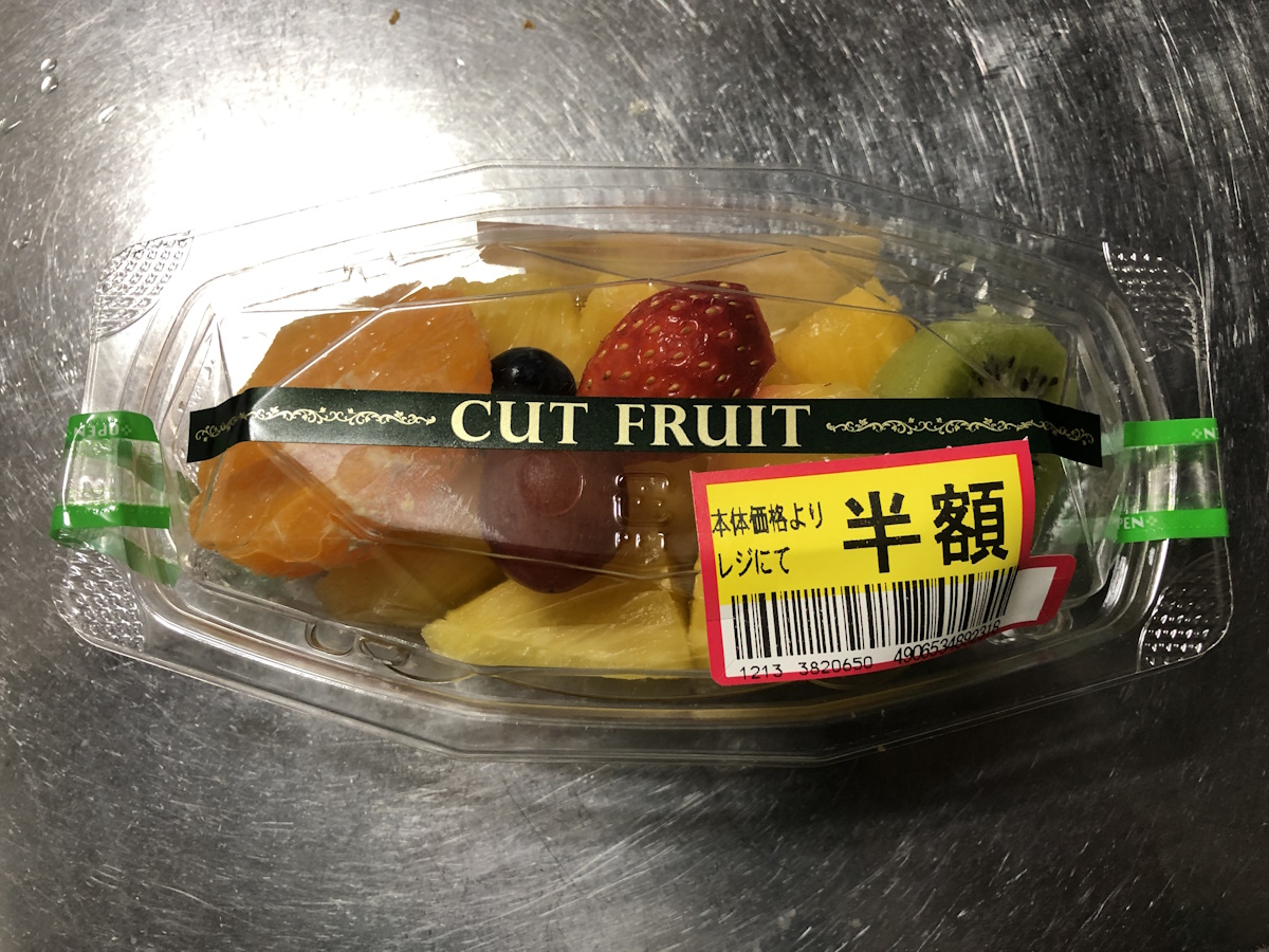 スーパーで見かけた半額のカットフルーツ賞味期限が近いから半額になってたのでたまに買ってみたけどイチゴ、みかん、キウイフルーツ、パイナップルなんかのブドウ、ブルーベリーま、どれも甘さとか味もまあまあでおいしかったかな