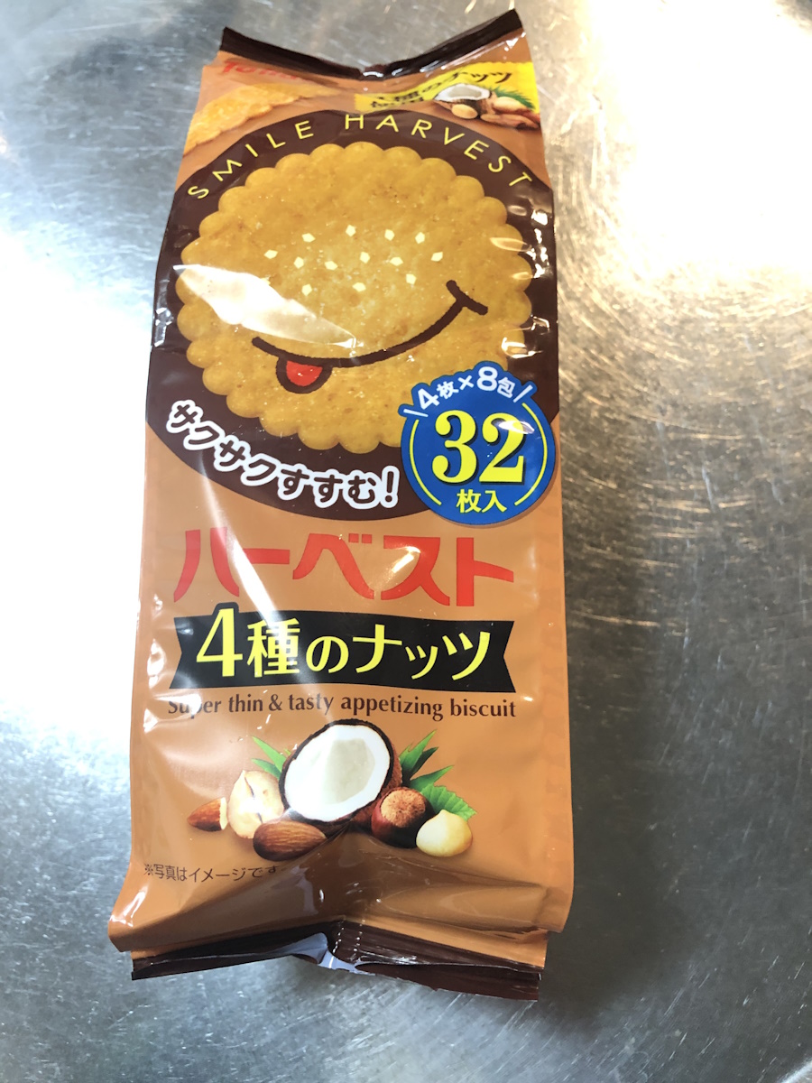東ハト ハーベスト 4種のナッツさっくりのハーベストがたまに食べたいかなと4種のナッツを開けるとふわっと薫る匂いはちょっと何とも言えないものがあるけどやっぱ、ナッツの風味は食べるとおいしいぃ★★★☆☆