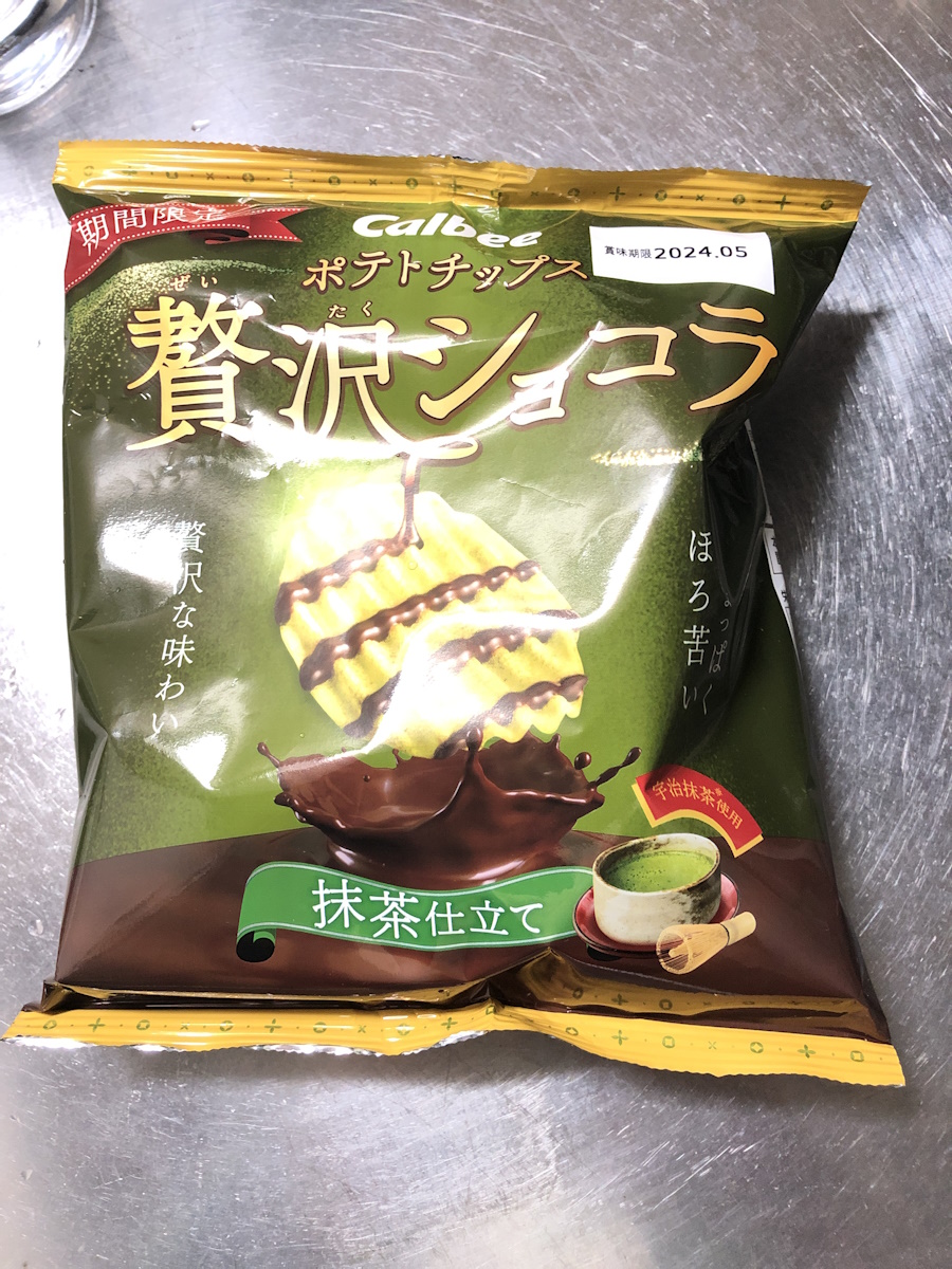 カルビー ポテトチップス 贅沢ショコラ抹茶仕立てあまり抹茶なお菓子って食べないけどちょっと食べてみたくなったので実際食べてみると少し抹茶の風味がするかなって感じでパッケージにあるようなほろ苦って言う感じは全然ないような気がするかな贅沢ショコラだからもともとの塩とそこにチョコというのがあってそれだけでずいぶん濃い味になってるからそこに抹茶をちょっとくらい加えても塩とチョコに負けてる感じがするかなぁ塩とチョコを減らしても良いような気がする★★★☆☆