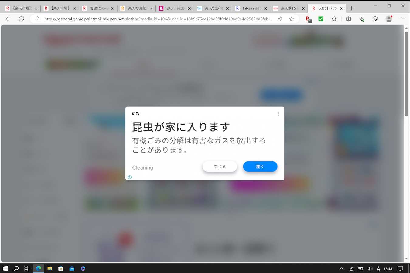 楽天ポイントモールゲームセンターで現れるGoogle提供の詐欺バナー広告昆虫が家に入ります と勇気ごみの分解は有害なガスを放出することがあります。って、関係性があるのかないのか意味が分からないことを言ってるって感じで詐欺だとわかるバナー