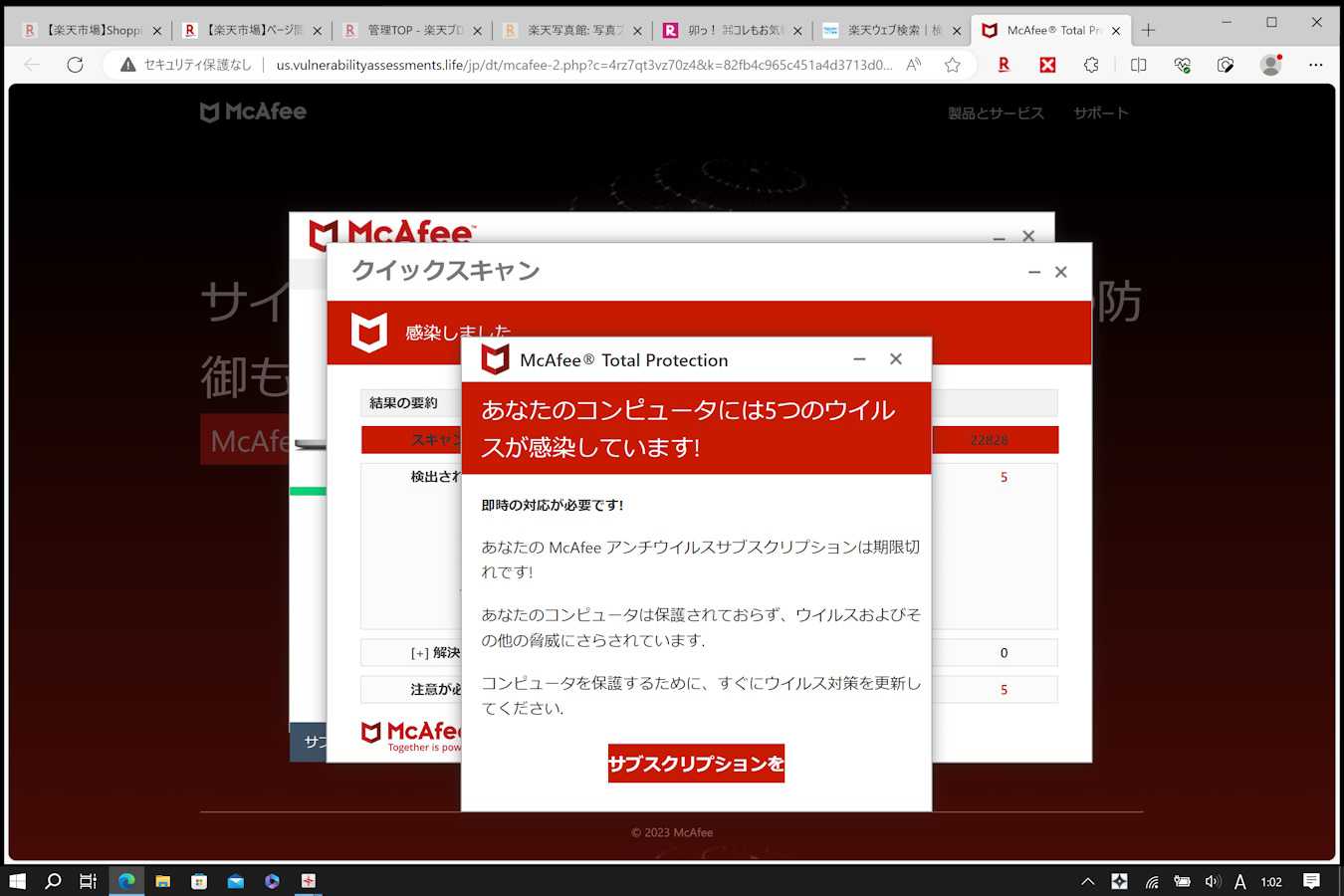 ここ数日かな?Infoseekを開くといつの間にかPCサポート詐欺の画面に切り替わってるInfoseekのトップページを開くとニュース記事のタイトル一覧があるけどそれを適当にクリックして放置すると画面下のバナーか右下からポップアップで出てくる動画広告にPCサポート詐欺画面にリダイレクトする悪意のある機能が埋め込まれてるみたいPCサポ詐欺画面は下のようなかんじでよく見かけるマイクロソフト関連のセキュリティ画面を装ったのとは違ってマカフィーに似せてるブラウザの戻るの機能が無効にされるような感じなのでタブを閉じないとInfoseekには戻れなくなる