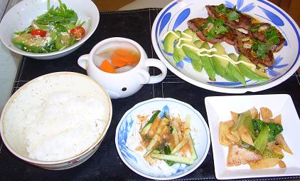 ぶはーーーっΣ(・ε・;) またも放置してました。。。写真は毎日一応撮るんだけどwなかなかその日のうちにアップできず、ズルズルとΣ(^∀^;)先週のいつかの夕飯●和牛ステーキ●大根と人参の中華スープ●筍炒め(たぶんその前日の残りもの)●長芋とキュウリの和え物●サラダ(これにもアボカド入ってるw)それにしても旦那サン食いすぎ。なんだ太んねーんだ(# ゚Д゚) ムカーアタイの脂肪わけたろか。そして、昨日の夕飯●小松菜とキノコのミルクスープ●パプリカサラダ●パプリカと豚肉のオイスターガーリック炒め●ゴマ豆腐(手を加える前w)ご飯(白飯)が、写ってないけどちゃんと出しましたよwwパプリカをここぞとばかりに使ってやりましたw今日の夕飯は、まだデジカメの中だぁーーってことでまた気が向いた時にアップwしょうもない記事、最後までご覧いただきありがとうございましたヽ(●´ε`●)ノ