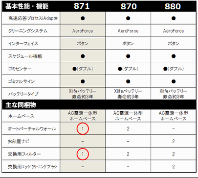 楽天で国内正規品ルンバ販売実績1位のエイ・ワンさんがルンバ871の予約を受け付けています。これです。【ダイヤモンド会員ポイント10倍(30日23:59迄)】【夏のパワフルキャンペーン5,000円相当消耗品プレゼント】【ルンバ新型800シリーズ】アイロボット iRobot 自動掃除機ルンバ871【新品/日本正規品】【ルンバ870と同デザイン・同性能】800シリーズは、880と870が販売されてるのですが通販では3月の発売以来、公式サイト以外では手に入りませんでした。ネットで最初から売ってしまうと、実店舗がショールーム化してしまうから、まず実店舗と公式サイトで販売を行い、期間をおいてネットで販売開始ということです。880と870の違いは、お部屋ナビ機能が使えるかどうかです。エイ・ワンさんの販売ページより抜粋。オートバーチャルウォール(作動領域を区切る無線壁が2個)が870お部屋ナビ(複数の部屋を移動するためのコントローラが2個)が最上位機種880についています。限られた領域だけを掃除するだけなら、ルンバ870で十分です。今回その870に兄弟機が出ました。871です。といっても付属品の数が減っただけ。870のオートバーチャルウォールが1個交換フィルターが1個になっただけです。それをネットショップ向けに位置づけのようです。ルンバ871をおすすめする方はこんな人。初めてルンバを使うのでどんなものか、できるだけ安く試したい。部屋の移動はさせるつもりはない。消耗品は、消耗して買う。そんな方にピッタリです。上の表の通り、どの機種を買っても、本体性能は変わりません。付属品で自分の用途に合うものを選ぶだけです。これで、価格 59,800円 (税込) 送料込 ルンバも最上位機種が、国内正規品でこの価格で手に入るなんて、かなりお得です。【ダイヤモンド会員ポイント10倍(30日23:59迄)】【夏のパワフルキャンペーン5,000円相当消耗品プレゼント】【ルンバ新型800シリーズ】アイロボット iRobot 自動掃除機ルンバ871【新品/日本正規品】【ルンバ870と同デザイン・同性能】ただ、ちょっと疑問なのですが、お部屋ナビを使いたい方は、現状エイ・ワンさんでは、価格 53,980円 (税込) 送料込 871より少し安いこのルンバ780(3年前から発売されている最上位機種で、現在も800シリーズと同時販売されている機種)を選ぶ事になりますね。今から買うなら、やっぱり吸引力や吸う仕組みの違う800シリーズが欲しいのですが、880と870は、扱っていないです。そのうち880も扱ってくれるのでしょうかね。便利な付属品 | iRobot ロボット掃除機ルンバ 公式サイト800シリーズ解禁と言っても、まずは、880や870をダイレクトに販売するのではなく、いったん消耗品や付属品のバリエーションが違うタイプ871を販売するみたいですね。何とかして、アイロボット社(セールス・オンデマンド社)の家電量販店や百貨店などとネット販売店の住み分けをしたい思惑があるんでしょう。あとエイ・ワンさんは、いくらか料金を追加すると◯年保証してくれるので、故障が心配な方は、僅かな金額なので、保証に入っておきましょう。けっこうルンバは、充電池周りのトラブルが昔から多いので。。700シリーズからそういうトラブルも減ってきてると思うけど。ついにネット解禁のルンバ800シリーズ871 はこちら 【夏のパワフルキャンペーン5,000円相当消耗品プレゼントルンバ870と同デザイン・同性能】今後通販で、870 880が出るのか?通販向けの型番で、付属品がちがう機種が出るのか?注目していきたいと思います。新型ルンバ871のネット通販