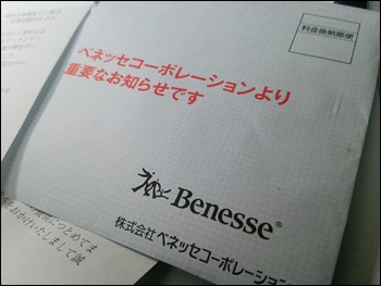 今日、ベネッセから娘へ封書が届いた。 やはり該当したんだなと、封書の表面を見てわかった。色んな所にレジャーにでかけて、そのつど名前や住所や電話番号を提供していて、かなりマーケティングに力を入れているなとは、感じていたけど。息子2人にはまだ来ていないが、時間の問題だろう。なんせ、長男は2歳からこの中学3年の中学講座まで14年間ベネッセ漬けになってるし、他の子も、同じようなもので、いくらベネッセにつぎ込んでいるか考えるとかなりの金額になると思う。たのむよまったく。。 やはり、会社が急激に大きくなるとそういったリスクも表面化してくるんでしょうね。いろんな人が業務に関わるわけで、全ての人間がベネッセ側につくはずもない。自分たちの利益のためだけに動く人も出てくるだろう。個人情報漏えいが、このベネッセだけでなく、いままでも数多く繰り返されてきてるけど、将来はもっと一点集中で情報が集まる(力のあるものに情報が集中する)傾向にあるので、被害も大きくなるだろう。まあそれの最たるものが、かのグーグルかもしれないけど。余談になるけど自分の毎日の動きがグーグルマップのGPSで、スケジュールはグーグルカレンダーで、グーグルドライブに仕事の情報など全て把握されているし、これからやりたいことはグーグルキープに入れてるわけで、万が一公開されれば、自分が病気でどこに通っているかなど全て、公開されてしまうし、検索できるようになるだろう。自分が検索しているデータも全てグーグルが把握していて現代人が何を望んでいるかがすべてわかるのですから、ベネッセどころじゃないと思うのは、私だけでしょうか? 怖いと思いませんか。Gmail使うの。。Google+で公開した個人情報などがGoogleの検索結果で表示されています。 <http://matome.naver.jp/odai/2138012417312597101> と思いながらも、メールだけ他の物を使うのも面倒な状況。 このベネッセからの文面も、内容はこの4つ。 データベースを停止したので安心してください。2次被害を出さないことに注視する。今後はデータ管理に気をつけていく。すいません。 結局書いていることはそれだけ。Yahoo! BB顧客情報漏洩の時にも、ソフトバンクBB加入者に対して500円の金券を配って沈静化させたが、今回はどうなるのだろう。結局個人情報と叫ばれていても所詮それくらいの価値しかない。ということか。 もうコピーされてデータはひとり歩きしているわけだから、100%回収もありえない。ジャストシステム以外の販売業者が、データを利用して2次被害をださないことを祈るしかないでしょう。 子供のデータは、かなり高く販売できるそうです。「1件当たり1円で買い取り、20円ほどで転売できる。子供の情報は希少価値が高く、もうけも大きい」 <http://www.itmedia.co.jp/news/articles/1407/11/news040.html> そういうところに人は群がってくるんでしょうね。 派遣社員がやったみたいですね。 ベネッセ情報流出 派遣社員が関与認める 7月14日 14時33分 ベネッセ情報流出 派遣社員が関与認める 「ベネッセコーポレーション」の通信教育サービスを利用している顧客の個人情報が大量に流出した問題で、情報を持ち出した疑いがある顧客のデータベースの保守管理に当たっていた外部業者の派遣社員が、警視庁の任意での聴取に対し、関与を認めたことが分かりました。 警視庁は、不正競争防止法違反容疑での立件に向けて捜査を進めています。 中略 関係者などによりますと、派遣社員は、ベネッセのグループ会社「シンフォーム」の東京・多摩市にある事業所で、ベネッセから貸与されたパソコンを使ってデータベースにアクセスし、個人情報を複数回にわたってコピーしたとみられています。 社内調査でも、派遣社員のIDが使われてアクセスした際にデータがコピーされた痕跡が確認されているということです。 警視庁は、不正競争防止法違反容疑での立件に向けて捜査を進めています。 <http://www3.nhk.or.jp/news/html/20140714/k10015993641000.html> 自分が子供の頃の生徒手帳は、全て福武書店だった。やはりあの頃から力はあったんだろうけど、今ベネッセがやってる、こどもちゃれんじのような付録がついた定期的な教材は、あのころで言えば、学研の科学と学習だったなあ。今はあの頃の教材とは比較にならないほど、ベネッセが多岐にわたって浸透してますが。 ↓ コレおもいっきり当事者です。何回同じ住所書いたことか?書くことによって13年*3人=39年間分(中学までとして、高校講座もベネッセにはあります)も顧客になるんだから、ベネッセからすればイベント開催費用なんて安いものでしょう。 ベネッセ子供向けイベント原則中止 情報流出で対応:アサヒ・コム http://www.asahi.com/articles/ASG7D30P1G7DULFA004.html約760万件の顧客情報が流出した通信教育大手のベネッセホールディングス(HD)は12日、個人情報を集める目的で全国の行楽地や観光施設で開いてきた子ども向けのイベントを原則、中止する方針を明らかにした。 トピックス: