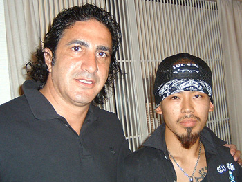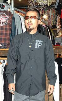 ~A&G for GABOR~ 実店舗アメリカンノスタルジックヒーローズの店長小泉君が、A&G for GABORの展示会に行って来ました。A&Gのメッシュキャップ、ブレス、トップ、ウオレットチェーンとフル装備の小泉君に、『ヘイ!ガイ、やっぱメッシュキャップはクールだナ!今度メッシュキャップ作るゼ!』と一言。アマール氏もご満悦♪肝心のアクセサリーはお見せする事が出来ないのですが、故ガボール・ナギー氏のデザインを忠実に再現したラインナップとなっています。注目すべきは、価格が"ガボール"よりも低めに設定されている点です。(SENSE6月号掲載) デザイナーはジュエリーデザイナーであり、レザークリエーターであるアマール・ゲソウス。彼はモロッコで生まれ、ワシントンD.C.の大学で学ぶため、1979年に渡米し、生化学の学位を習得。その後、LAに移り、いくつかのインディアンの部族を訪ねるうちにバイカースタイルに惹かれ、 自らバイカー用のレザージャケットを作り始めたのをきっかけにオリジナルブランド“A&G”を設立した。クオリティの高さとハードな中にも繊細なデザインが特徴。フレンチテイストのゴシック調モチーフをイメージしたオリジナリティが魅力となって国内外のミュージシャンやアクターたちに支持され、現在も各国のセレブリティが顧客に名を連ねている。