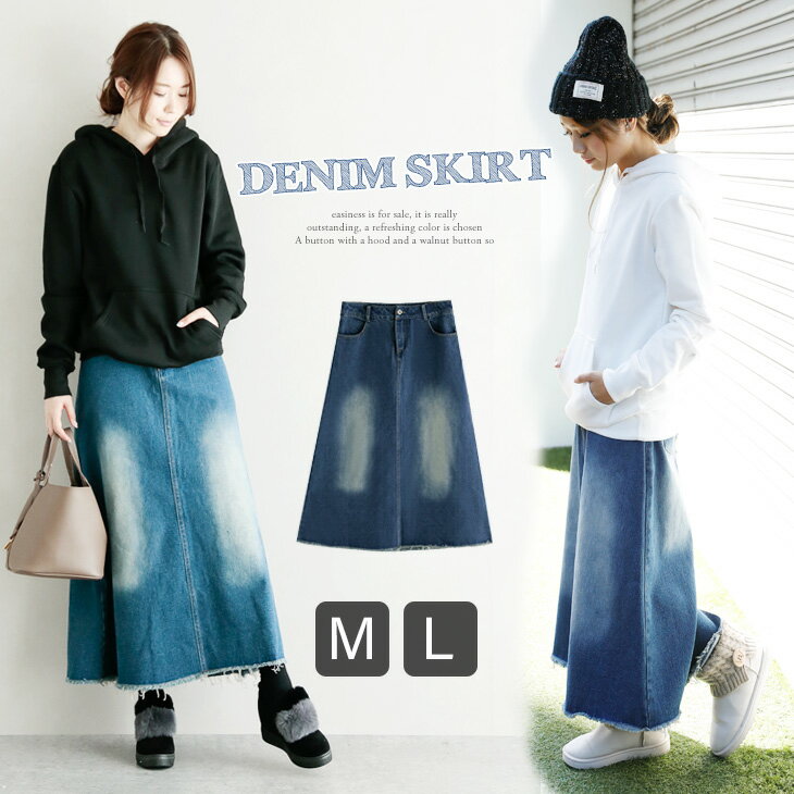デニムスカート ロング マキシ丈 レディース 春 夏 秋 デニム ロングスカート タイトスリット ひざ下 膝下 切りっぱなし ウエストゴム リメイク風 大人 カジュアル 30代 40代 通販 楽天 コーデ ユーズドブルー ネイビー M L 無地 cp17-b066