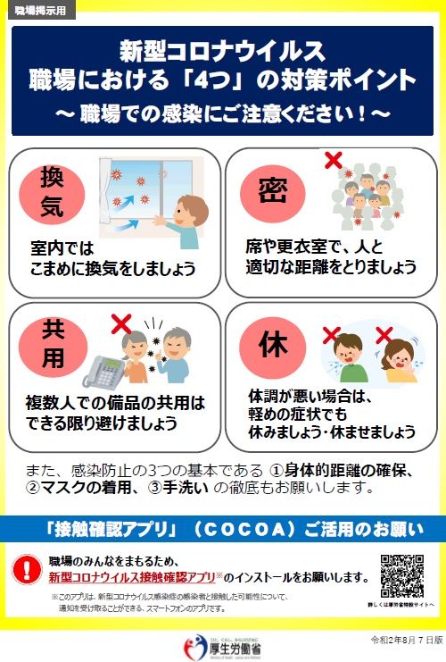 コロナ対策室より… 職場における、 4つの 感染防止対策ポイント… ***** コロナ対策室Twitterより 厚生労働省 HPでは 職場 における「4つ」の 新型コロナウイルス 感染防止対策ポイントを示したポスターを掲載しています。 (1)室内でのこまめな 換気 (2)席や更衣室での人との適切な 距離の確保 (3)複数人での備品の 共有を控える (4)体調が悪い場合の 積極的な休息の確保 が「4つ」のポイントです。職場 での感染にご注意ください! 出典:新型コロナ対策室Twitter ***** 厚生労働省HPからだと… ホーム >政策について >分野別の政策一覧 >健康・医療 >健康 >感染症情報 >新型コロナウイルス感染症について これ… 辿りつかないわぁ… (>_<) ドウユウコト⁈ 複雑すぎる⁇ フェイスシールド 職場で、 備品の共有を控える… のは、 厳しいよね… じゃ、 アルコール除菌 置いておきますか… ( ̄◇ ̄;) ダイジデス 今夜も、 ギリギリ… ^ ^ では… 【ふるさと納税】お徳用『清晃アグリ』のお徳用みかん★約4kg(2S-2Lサイズ) 予約受付中 フルーツ 秋 旬★熊本県玉名郡玉東町 健康な土で育つジューシーおいしいみかん!ちょこっと訳あり《11月中旬-12月末頃より順次出荷(土日祝除く)》