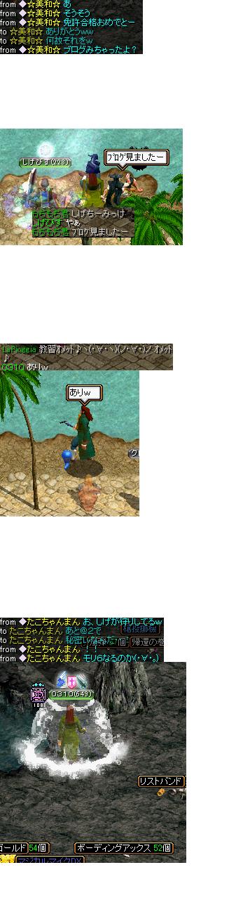 こんにちは今日は3月1日!実は高校の卒業式でした高校3年間、振り返ってみるとあっという間ですねw色んな人に出会えて本当に良かったと思います^q^さて、昨日は緑鯖大戦最終日でしたね~実は僕、全部のGvにでました^q^メインとGVが重なっててもGMさんに許可をもらって出させて頂きました!!!でもその日は慌しくて心臓を買う時間がありませんでした(神秘の石のかけらが見つからなくて・・・)でもどこかのブログで見たんです僕はネネからもらえる心臓は取引不可だけどあることをすると他キャラに渡せる・・・っという話実は先日230制限Gで活動している「しげさん」がGvあったんだけど取引不可の心臓たくさんあまっちゃって困ってたんです。あることをしてみましょう^q^腰に心臓を詰め込んで、ベルトを外せ!!そしたらCC(キャラクターチェンジ)をして只管スペース連打ですよ^q^こんな感じでしげさんのイベントリーにあった取引不可の心臓をしげちゃんに全部渡すことができましたこの原理なら、課金心臓とか、課金油も別IDに移せるのかな?今度だれかやってみてwってわけで今日は緑鯖大戦最終日です転送する魔方陣内に放置して戻ってきたらもう始まってた( ゜Д゜)y \_ポロッ遅れてしまってすみませんでした;;大戦の方は相変わらず互角すぎるwwwwwwwwwwwwww池チャンの指示が冴え渡ってましたね気になる結果は春夏勝利!!9月万歳!!!春夏最高!!!!ってことで、春夏vs秋冬は、2勝2敗でした!!いやーどっちも強かった!!Gv終了後シュトラセラトのホテル前で記念撮影すごい花火です画面が花火で埋まりました( ゜Д゜)y \_ポロッもう卒業しました(*´σー`)エヘヘ緑鯖大戦お疲れ様でした4戦全部に参加しましたが、特に最終戦は萌えました・・・じゃなくて燃えました主催者のちょっと臭い人とひーくんお疲れ様でした!オマケ緑鯖大戦を通じて話したことのない人と仲良くなれたのは本当にうれしく思いますちゃらさんブログは昔から見てたけど大戦が始まるまでは話したことがなくてどういうひとなのだろうと思っていました話してみると僕のブログも見てくれてるみたいでとてもうれしかったです!これからもよろしくお願いします4692ナンバーズでちょっとだけ一緒だったけど全然話したことなくて、今回緑鯖大戦で同じ春夏になって色々話せてよかった!GD誘われたのにいけなくてごめんなさい^q^カミサマンさん同じ紫鯖出身ということで何度かお話しました^^今度紫に遊びに行くので一緒に狩りしましょう!!0180相手だったけどGv前に必ず耳がきて怖かったです・・直接はあまり絡んだことがなかったけど緑鯖大戦を通じて仲良くなれた気がしますですが、倒せなかったのが残念でなりませんそしてお別れの時ですしげちゃんはエンペラーに戻りました。今後ともよろしくお願いします!