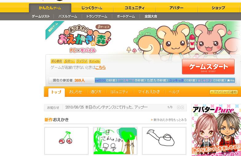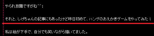 おはようございます!たかしげです。最近は殆どRSにはinしてません;;inしてるのはGvのときだけですね(;´Д`)y─┛~~最近はまってるのがサドンなんだけどそれよりもはまっているものがありまして・・・それは何かと言うとですね ハンゲームの集まれ!お絵かきの森ヽ( ・∀・)ノ イェーイまじこのゲーム面白すぎるwwww2人以上で出来るんだけど1人が絵を描いて、それをなんだか当てるっていうゲームしかもお題が目に見えないものとか多すぎて困るww(熱いとか寒いとか)んで昨日海賊メンバーでやりました!(渡辺夏海、まゆゆ、かるみる、じゅい、エルザ、俺)スカイプしながら朝4時過ぎまでやってた(;´Д`)y─┛~~ちなみに これじゅいの作品なんだけど、なんだかわかります?wこの後この怪しい建物のサイドに老人2人現れたんですが結局誰も答えられずwwwwwwwww答えは旅館だそうですwww まぁみんな結構重症か(;´Д`)y─┛~~再び描き手じゅい現る!! この絵は一体・・・・?