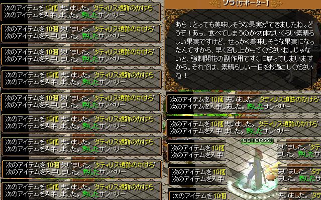 こんにちは、しげびすです。最近になって、やっと生活リズムがもどってきました。なおすのに1ヶ月近くかかったのかな・・・。来週から春休みがはじまるし、また生活リズムが狂うと思うととても怖いです。そして今日は大学でテストがありました。テレビをモニターにして気分上々↑↑色々弄ったり、遊んでたりしたら・・・勉強殆どできませんでした^q^ナンテコッタイ一夜漬けじゃ頭に全然入らなかったし これは追試ふらg<>・・・ということでRS。昨日、一昨日はEMなんたらのイベントがありましたね。「EMこっそり営業中」みたいな感じのイベントだった気がします。緑鯖は昨日だったので、いっぱい買ったろう!って気合入れましたよ。ええ。1時開始だったんだけど、緑鯖は1時からじゃなかったみたいでとりあえず1時開始の黒鯖に突入。EMを見つけたら即買!ではなくてみんなが集まったらEMが露店を開いて、それを俺たちが買うという所謂連打ゲーでした。とりあえず自分も連打連打連打。カチカチカチカチ・・・と響くクリック音。そして・・・!見れた・・・!見るのがやっとという感じでした。さすが黒鯖。しかもなんだこのリング・・・え。でも指1つで火抵抗40%も稼げるなら地下キャラにいいかもね。俺はいらないけど(;´Д`)y─┛~~そして、ついに緑鯖にEMが現れる時間に!緑は過疎鯖って言われているし 結構簡単に買えるんじゃないかなって思ってたんだけどね。おい、誰だよ緑が過疎鯖って言ったやつ200人、いや300人はいたんじゃないかな。一応連打したけど、買える気配なし。てか売り物すら見えなかったぞ。しかしそんな中つーさんが。例の火抵抗リング買いやがった( ゜Д゜)y \_ポロッ