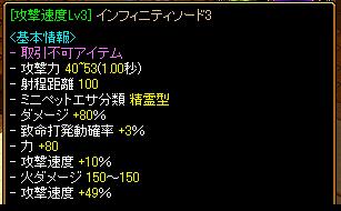なにあの人。ブンデスの動画とか見ても、なんかよくわからんけど得点によく絡む人だなぁって、位置取りがうまいんかなぁって思ってた。今日もだけどさ・・・シュートと言えないようなシュートなのに、しっかり決めるあのうまさ・・・なんか本田も香川がいることでいろいろやりやすそうに見えた(素人見解こっからRS。ご無沙汰してました。先日の鏡連敗が結構ショックで、ずーーーーっともやもやしてたんです。んでらしくもなく貯金生活をしてました。ロトキャンにも結局しっかり釣られてます。んでなんやかんやで下級抽出が手に入りました。今結構懐に余裕あるし(次回鏡分は十分確保できてる)、ここらでなんかやっときてえええええ、ってね。まーなにやるんだって話なんですけど、剣士育ててて、最終的に武器を何にするかって考えてたら、不滅とか速度オプシとかどうも嫌なんですよね。不滅はやっぱ売れないのがでかい。速度オプシとか要求高すぎワロス。んじゃやっぱベースは∞だべってことで。(絶対そのうち、確実に1段階強化できるようなアイテムが出ると思ってるから)速度50素材を探してたんですが・・・最近全然売ってねえ。知り合いを当たってみたけどもうストックはないらしい・・・まぁ気長に探すかって諦めかけたとき、倉庫Gを覗いたら・・・49%素材があるじゃないか。こらやるしかないだろ。もうフラグ立ちまくりだろ。勢いでぽちっ。久々の引っ張り。そうよ、あなたの予想どおりよ・・・期待してどーーーーーーーーーーーーーーんおやすみなさい。