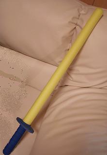 ちっちゃな話で恐縮ですが、 『なんだか腑に落ちないおもちゃ』を買ったのでそのネタ。 夫がベビーにおもちゃを買ってあげました。 それがこちら。 ちゃんばら王(キング) スポンジなどの軟らかい素材でできています。 長いものを振り回すのが大好きなベビー ほうきとか、布団たたきとか振り回しています。 ベビーも危ないし、周りの人間にも危害が これなら危なくないかな?と思い購入。 大喜びで振り回して遊んでいました。 気分は勇者? 母は何度か切られました ただ、剣の先をかじってしまい、 しかもちぎれる事が分かり剣は封印になりました まあ、対象年齢6歳以上ですからねー。 ほうきを振り回すよりは安全かなと思ったんだけど 封印になったこと自体はいいんですが、 近頃の製品の注意書きって、「そこまで書くかな~」って思うことないでしょうか? PL法のかげんなのでしょうか? というのも、 この『ちゃんばら王』おもちゃの注意書きが、 読んでびっくりだったんです。 ●人の顔や動物に向けて絶対振り回さないでください 失明や怪我などの危険があります。 ●ぶつけたり、ふりまわすなど乱暴な遊びをしないでください (以下省略) まあ、一つ目の 『人の顔や動物に向けて振り回すのを禁止』するのは分かりますが… 二つ目の『ぶつけたり、ふりまわすなど乱暴な遊びをしないでください』って? あの…ちゃんばらですよね? ※注:ちゃんばら…刀で斬(き)り合うこと 人にぶつけないのはともかく、ふりまわさないって...??? その注意書きにしたがうと、どういう遊び方になるんだろう??? 腰にさして歩くとか? ポーズをとって遊ぶとか? でなければ、観賞用? 気になったので、 池田工業社のサイトを見てみました。 ちゃんばら王、あった、あった!→ちゃんばら王のサイト 特に使い方の詳しい解説はないけれど、 気になったのが、『キッズスポーツ』に分類されていました。 ちゃんばらがスポーツなのはいいんだけれど、 振り回さないでどんなスポーツをするんだろう…。 何を目指して作ったおもちゃなんだろう。。。 なぞが残ります。。。