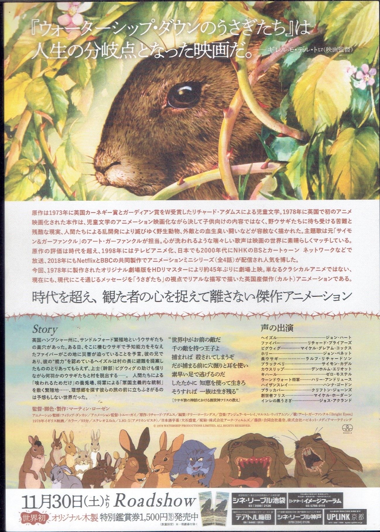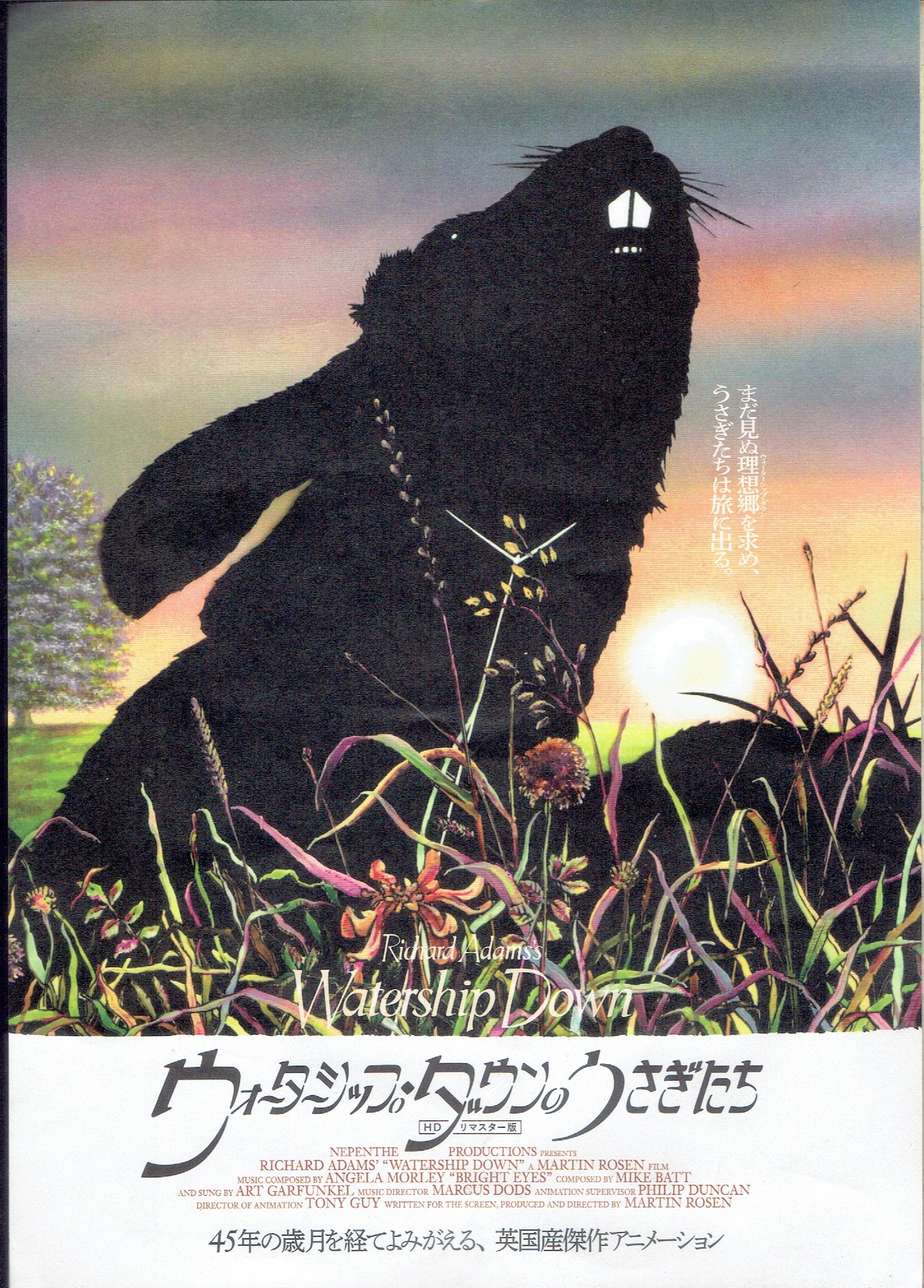 ほとんど 半世紀前のイギリスのアニメーション映画です。 原作 は リチャード・アダムス 、 アニメーションの監督 は マーティン・ローゼン 。あのころ、 ムツゴロウさん こと 畑正憲 が 日本語版を監修 したとかいうことで評判になりましたね。 絵本 は知っていましたがアニメを見るのは初めてです。