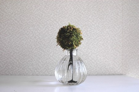 夏になると、水管理が出来ずに汚くなる「こけ玉」ですが、夏も自動給水出来て青々していたらいいなと思って、【SIMERUS水やりテープ】を使って自動給水させてみました。 チュッパチャップス?のようですが、棒の部分に巻いた 【SIMERUS水やりテープ】からこけ玉の下に巻いた【SIMERUS水やりテープ】に水が給水され、全体的にほどよく湿っています。※ 【SIMERUS水やりテープ】がとても薄いのにちゃんと自動給水機能がある特殊素材なので、ぼとぼとに湿ることなく軽く湿らすことが出来ています。※給水中の【SIMERUS水やりテープ】を押さえても水が出ませんが、普通の給水用の不織布マットやテープでは厚みがあるので、押さえたら水が出るほどぼとぼとになります・・・目を付けたら、スーモくんに見えるかな?
