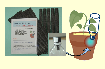 野菜作りや花作りに最適な季節になりました。今から取りかかるなら、留守や夏の水やりのことも考えておきませんか? まずは一番簡単なタイプのご紹介です。ペットボトルのキャップに取り付けるだけで、自動水やり器が出来る【SIMERUS水やりテープ】の素材をリニューアル!新しい【SIMERUS水やりテープ15】は、基本の使い方(ペットボトルに取り付けて土に挿す)以外に、底面給水でも利用出来るようになりました。 底面給水用としての使い方もいろいろ。 1 底面給水ひもとして利用する。2 プチ底面給水シートとして利用する。苗を透水性のある防根シート等で包み、低く張った水にシート(水やりテープ5~1本分)の両端をつけて、苗をシートに載せる。水位の高さに穴をあけたペットボトルに水を入れ、置く。3 水を貯めないで、底面給水する! ※テープを取り付けたペットボトル型自動水やり器との合わせ技♪ 底面給水は、どちらかというと過湿になりやすい給水方法ですが、この方法は基本のペットボトル型自動水やり器に近く、『軽く湿った』状態を維持します。 留守や夏の水やりを考えて、一手間かけて植えると、後々とても楽になります。