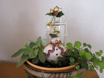 クリスマスも近くなってきたので、今まであった観葉植物の鉢に少し手を加えてみました。ワイヤープランツともう一つの名前は忘れました・・・KAGOMEラブレの130mlのペットボトルに【SIMERUS水やりテープ】をセットして、カバーをかけてみました。 5号鉢の小さなものなんだけど、ちらっと雪だるまと目が合うと、なんとなくホンワリとした気持ちになります。 水やりは、ペットボトルの水を【SIMERUS水やりテープ】で自動給水しているのだけれど、観葉植物が小さいせいか、130mlの水で1週間以上保ってます。もちろん鉢底に廃水は出ていません。 玄関用にもう少し大きな寄せ植えを作りたいのですが、何の花を使おうかなと思案中です。 【SIMERUS水やりテープ】は、どんなサイズのペットボトルにも利用できるので、留守の水やりに使うときは、500ml以上の大きなもの、寄せ植えやハンギングに使うときは、見えないように小さめのものをいくつか仕込んでます。もちろん大きめのペットボトルに色を付けたり、セロファンなどを貼り付けたりと、わざと目立つようにするのもおもしろいですね。