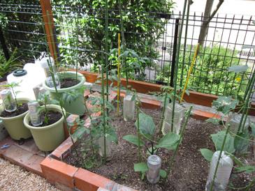 庭の一角に雨がかからないようにして作ってある菜園の野菜たちも順調に大きくなっています。ここでは地植えではなく、大型の野菜プランターや鉢で栽培しています。植えてあるのはトマト、キュウリ、なす、ピーマン、ブルーベリー。※この他に軒下?にジャガイモとプチトマトもあります。写真左の大型プランターには【SIMERUSフロートVG】を入れる予定なのですが、とりあえず、【SIMERUSフロート】と【SIMERUS水やりテープ】を使っています。※大型野菜プランターだし、これからの時期トマトなどかなりの水を必要とするので早くVGに変えたいのですが・・・写真中のトマトは、野菜用の10号鉢で【SIMERUSフロート】を2個、同じ鉢のもう一つのトマトには【SIMERUSフロート】1個と2Lのペットボトルを利用した【SIMERUS水やりテープ】で給水しています。 キュウリとナスとブルーベリーの給水は、もうすぐリニューアルの【SIMERUSフロートL】でしています。※キュウリは、これから暑くなると補助的に【SIMERUS水やりテープ】を使うことになるかも・・・ ピーマンは【SIMERUS水やりテープ】で水管理です。※ピーマンとナスは野菜用8号鉢です。 とにかく今年の野菜たちは本当に元気に育ってます。