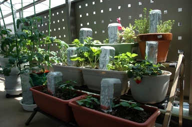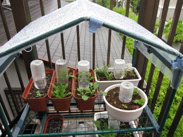 雨が降って寒い一日でした。先日移動した菜園棚(簡易温室の棚に雨よけのため屋根部分にビニールシートを取り付けてある)にもしっかり雨が降っています。・・・我が家のベランダは南に向いているものの、菜園棚を固定してあったせいか、・・・洗濯物の陰になったり、日の当たり具合が変わってきたりするせいか、・・・なんとなく日光不足のような感じだったので、・・・イチゴは庭の棚に、他はベランダ横の踊り場に移動しました。 【SIMERUS水やりテープ】を使ってペットボトルで自動給水しています。菜園棚には簡単だけど雨よけがしてあるので、直接野菜やハーブに雨はほとんどかかりません。※雨よけ栽培は、水管理が出来るので野菜の質がよくなります。で、雨が降っていても雨水はかからないので、給水のためにペットボトルの水は減ります。もちろん、晴れの日ほどではありませんが、土の乾湿にあわせて水は供給されています。※詳しくは緑水学舎HP(http://www.simerus-rg.com/rain1.html)を参照してください。 写真ではわかりにくいのですが、下段にもガーデンレタスの鉢が置いてあります。【SIMERUS水やりテープ】での自動給水だと、鉢底からはほとんど水が出ないので、下のガーデンレタスに上から排水がかかることはありません。 ※通常の水やりや雨がかかったら、上の棚の鉢から出る”たっぷりやった水の鉢底から出る汚水”がかかってしまうので、このように2段に置くことは出来ません。 とにかく、棚の野菜やハーブは場所移動してから元気に育ってます! ただ、庭に移したイチゴに関してちょっと問題が・・・・それはまた後日。 ※ペットボトルのカバーは説明のためわざとはずしてあります。