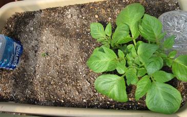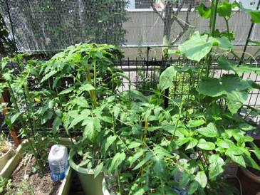 週末2日ともで、まだ4月だっていうのに暑かった・・・ベランダの野菜たちはスクスク育っています。日の当たり具合を考えて、鉢の置き方を変えました。※3段の鉢置き台を利用 ジャガイモは一週間でこんなに大きくなりました。 トマトだって