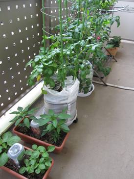 マンションのベランダに菜園を作り始めて、3ヶ月。イチゴから始まって、ジャガイモ、ガーデンレタス、ルッコラ・・・種類もかなり増えました。みんな順調に大きくなり、美味しく食べたものもずいぶんあります。 水やりは、【SIMERUSフロート】と【SIMERUS水やりテープ】で自動給水しています。今のところ、ベランダの床にプランターからの排水はありません。 野菜もハーブもスクスク生長し、トマトにはもう実がなりました。 ※【SIMERUS】システムは24時間、“軽く湿らす”状態を維持するように土の乾湿にあわせて、自動給水しています。