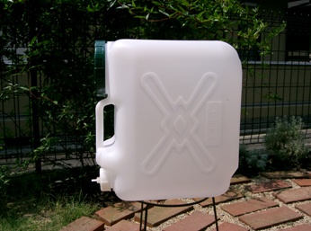 【SIMERUSフロート】等で利用する水タンクは、ホームセンターなどで販売されている水用タンクをご利用頂けます。セット内の【ビス付きタンク用キャップ】を水タンクの口に取り付け、給水チューブを接続すればすぐ利用できます。この水タンクを横置きにする場合は、タンクに8mmの穴をあけ、【ビス付きタンク用キャップ】のビスを取り付けます。この応用でお好きな容器をご利用頂けます。 これはバケツを利用したもの。これはミルクポット。これは、ブリキのジョウロに穴をあけて使ってます。 タンクはいろんな形のものを使えますが、設置される場合は、倒れたりすることがないよう、また濡れてはいけないものの近くには置かれないようにくれぐれもお気を付け下さい。