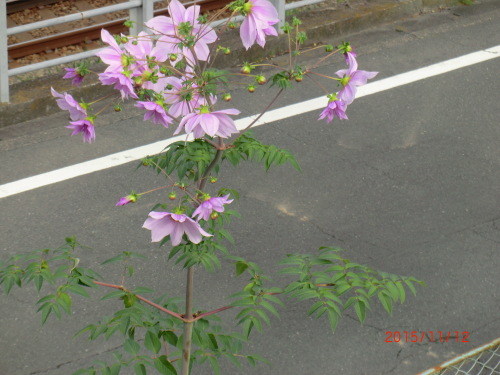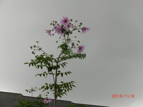 待ちに待った「皇帝ダリア」咲き始めました今年の3月頃に2本購入してすくすくと伸びて、丈は約4mぐらい見上げるほどになった「皇帝ダリア」秋深い11、12月頃に、ピンク色の花をいっぱい咲かせると云うので白内障のOP後、最初に見る花として楽しみに植栽しました今は右目だけ開眼だけれど充分よく見えるつぼみが沢山あるので、これからどんどん咲きそう左目は来週16日両眼でしっかりと見るのが楽しみ皇帝ダリアは大好きで、今までは熱海の沢田美術館に見に行って、写真を撮ったりししていましたがどうしても咲かせたくて探して庭に植えたのです2009年11月15日「澤田美術館」で皇帝ダリア(コダチダリア)2013年11月22日 「澤田美術館」で皇帝ダリア別名:キダチダリア,コウテイダリア(皇帝ダリア)原産地:メキシコ花期:晩秋ダリアの原種だそうで,草丈が 3 ~ 4 メートルにもなる超大型種花はピンクで,日照時間が短くなると咲くという短日植物で,11 月以降に開花するということです