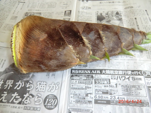 今が旬のたけのこが豊作のようですねこんな大きな筍10日前にも、この大きさの筍 2本 頂きました大きいけれど 掘りたてなので柔らかく美味しい毎日、タケノコご飯、煮物等々 味わっています筍の栄養素はタンパク質や食物繊維、そして血圧を下げるのにも有効なカリウムを豊富に含んでいるそうです食物繊維が豊富なのでお通じにもいいですし、美肌に有効なビタミン類も豊富そして栄養素が豊富なのに脂質は少ないのでカロリーはかなり少ない食材良いことずくし