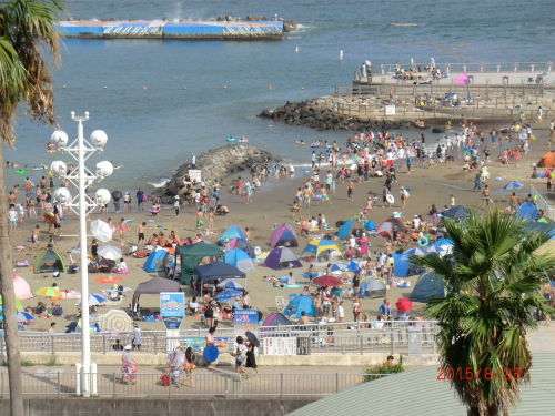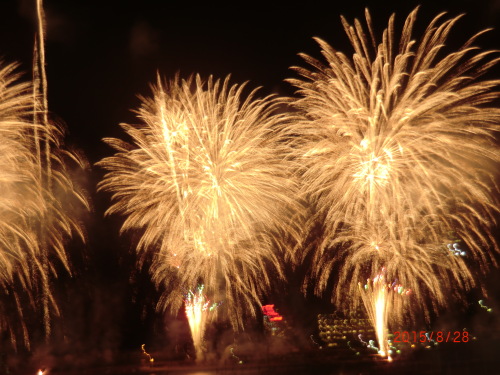 8月23日(日)夏花火第6弾台風の影響で白波も立っていましたが日曜日なので、サンビーチは朝から家族連れで賑わっていました夜8時20分からは花火大会もあるのでそのまま5時過ぎても砂浜に、残る人たちも多かったですいよいよ8:20花火打ち上げの時間です台風の為、風が強かったのでいつもは防波堤から打ち上げるのですがこの日は、熱海港七半岸壁から打ち上げられましたメインの締めに打ちあげる‘空中ナイアガラ’は 少しコンパクトでしたが、立派で、観光客たちも歓声を上げていました