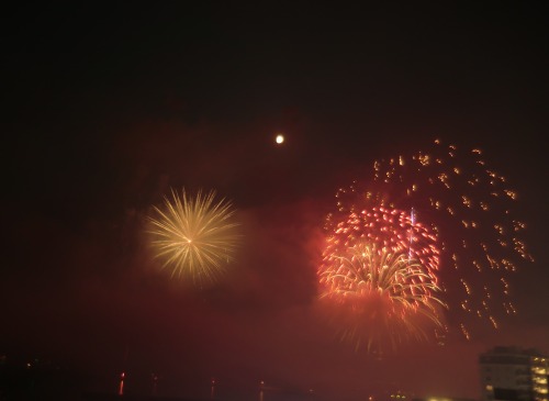 夏花火第2弾7月30日(木)夏花火第2弾満月でした満月と大輪の花が夜空を明るく照らしていました防波堤から打ち上げられた5000発観光客・市民を感動させ大迫力に大きな歓声も上がりました駐車場の車も、花火が打ち上げられるたびにビービービーと大音量で車が鳴りだしますすごく感度の良い盗難防止アラームだといつも思います夏の花火大会は今後8月5、7、17、23、28日に催されますいつも熱海の花火大会は日曜日なのに夏場は5(水)、7(金)、17(月)、23(日)、28(金)と平日です夏休みを意識しているのでしょうね時間はいずれも午後8時20分から30分間で5000発雨天決行です