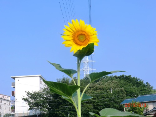 暑い 暑い 暑い連日、35℃ 36℃という猛暑が続きますね 皆様お元気ですか猛暑お見舞い申し上げますこの猛暑をお互い元気で乗り切って行きましょう私の庭に‘ヒマワリ’が咲きました真夏に相応しい花です背丈は2m位で私よりも高いです全部で5本ありますヒマワリから元気を貰えそうです