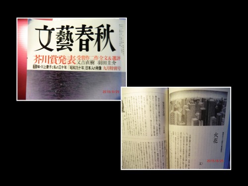 「火花」又吉直樹著は、今、話題になっている本「火花」又吉直樹著は、今、話題になっている本又吉さんの事は、全然知りませんでした又吉さんの独特の風貌が、時々TVに出るようになってピースと云うお笑いコンビであることも初めて知りましたそしてあまり聞きなれない苗字「熱海の花火大会」が書かれているからには、読まなくてはと、急いで本屋さんに行ったら品切れ少し待って又本屋さんに行ったら、入りたてと云うことで山積みになっていたこの本は直木賞を取ったのが、ピースの又吉さん、漫才の又吉さんんと云うことで話題性も多く、作家なら誰でも狙っている直木賞を取れた驚き多分驚きの方が多いと思うが・・・「文藝春秋」9月特別号(8月7日発売)は92万3000部と「異例」の発行部数早速購入して、読みました「火花」「花火」とタイトルがどっち?これもコント? なんて云いながらマンションの住人と。大浴場の温泉に入りながら、話題にしました夏の花火大会が始まる前、午後3時から、レインボーデッキのお祭り広場では花火見物の人々をひきつけようと飲食店だの熱海在住の演歌歌手だの、その時々で違うが無名の漫才コンビも、人寄せプログラムとして組まれているのですが「火花」は書き出しから熱海の8時20分から始まる花火大会の前座としてまだ無名のお笑いコンビが出演して「熱海の花火大会で、徳永(又吉)が、先輩芸人・神谷と電撃的な出会い」をすることから始まるのです出演者達は、花火会場に行く人達が通りすがりに見ているのと同じようにチャチなな舞台(今は立派になりましたが)の上で花火見物客の行動を、コントをしながら、クールに見ているのです綿密な情況描写そして人間の心理状態を表現しているのが上手いですお笑い芸人だからって、いろいろな見方がされるのでしょうけど思ったよりも好感が持てた小説でした毎回「熱海の花火大会」は見ていますが、お祭り広場に漫才コンビのピースが出演していたのは、何時だったんでしょう?私としては最近の漫才・コントには、ついていけないのだけれどピースの漫才を聞かなかったことが残念です最近の若手の芸人達は、裸を見せたり、理屈っぽかったり、パホーマンスで笑わせようと、一生懸命名のは分かりますが、何処が面白いか、私にはとてもついていけなかったですところが、この本を読んで、若手芸人達は、寝ても覚めてもネタを考えているのですね丁寧に書かれている人物描写に、見る目が変わってきたのですTVに出ている若手芸人達を、嫌いと云わずに、もっと優しく見てあげようと思った次第です又吉直樹さんが、「火花」で直木賞を受賞してその舞台が「熱海の花火大会」だったからでしょうか若い人たちが、どんどん「熱海」にやってくるようになり駅前商店街は大賑わいです私は、ここしばらくは、又吉さんのことに目を離せないです