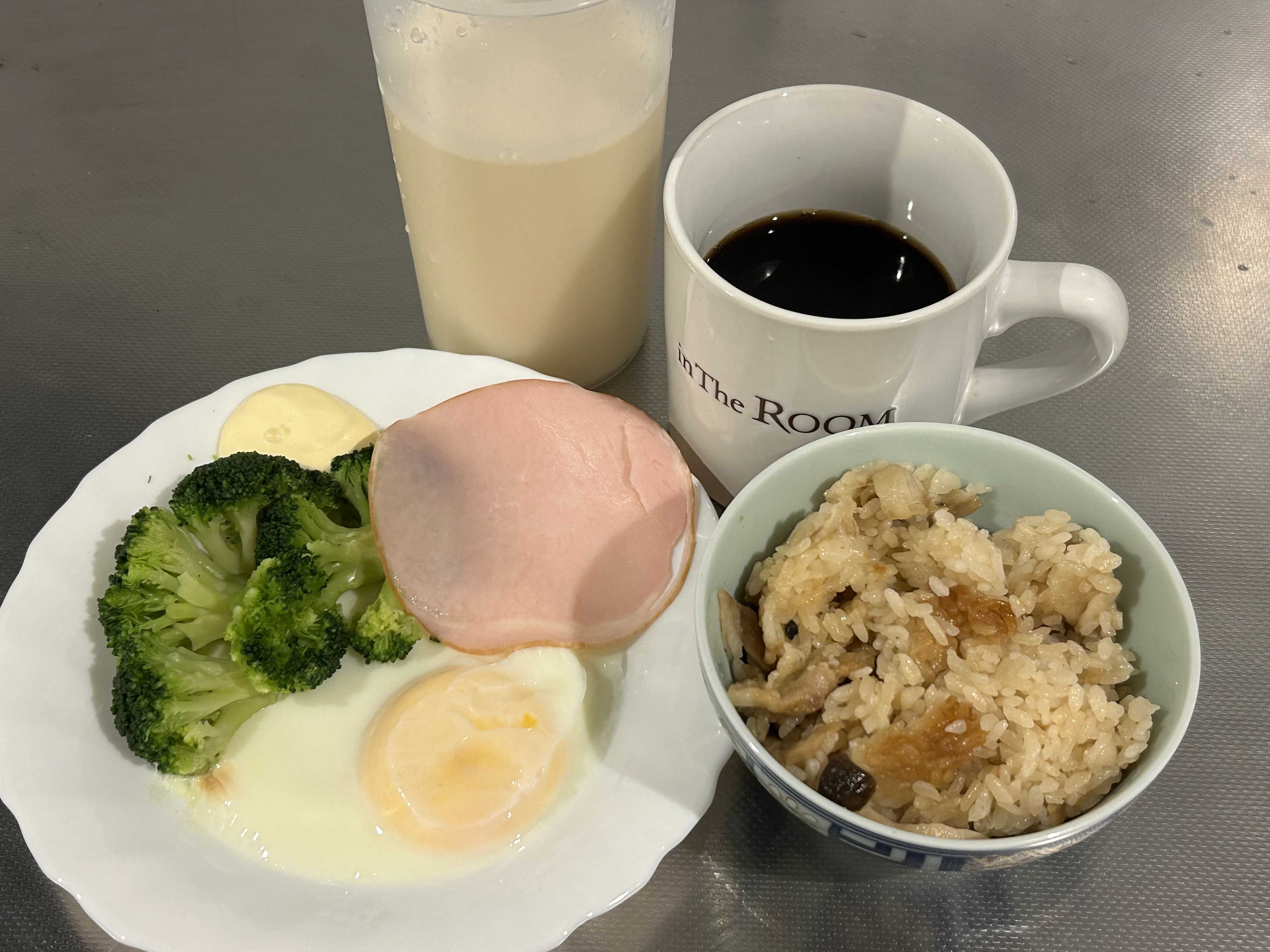 おはようございます。本日のメニュー。プロテイン目玉焼きブロッコリーハム炊き込みご飯コーヒーあと、マヨネーズ。ちょっと食べすぎちゃったかな?と思いきや、満腹感あり今日も頑張れそう。外は雨ですが、本日も楽しく行ってきまーす!体重73.4kg