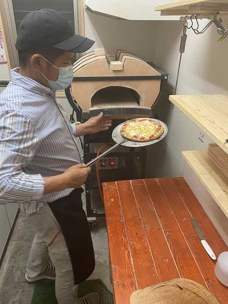 お店に行くとピザの生地はもうこねて発酵されていたので、それを丸く薄く伸ばすところからやりました。