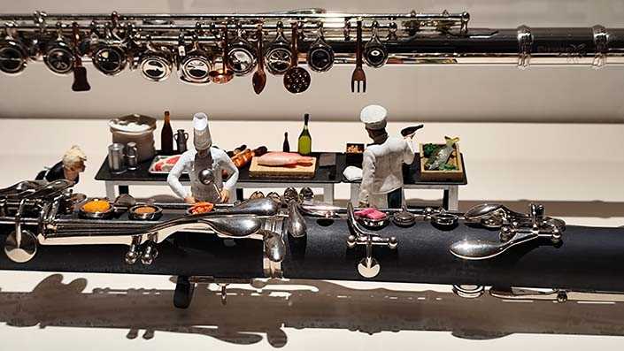 今回行った展覧会は「田中達也展-みたてのくみたて-」。ミニチュアの人形、食品サンプル(たまに本物の食べ物を使用)文房具などを使ったフォトを制作している田中達也の展覧会。過去に「MINIATURE LIFE展」を京都高島屋で開催しているが今回は「HOME」「FORM」「COLOR」「MOTION」「LIFE」「WORLD」というゾーンを設定し、ポイントごとにフォトスポットが置かれてるという設定。フォトスポットに立ち止まって写真を撮ってる方も。 フォトの横に現物が展示されてたり、フォトフレームの外に人形が置かれているのは過去の展示通り。 今回はフォトができるまでを映像とラフスケッチで紹介されているスペースがあった。・パンをソファに見立てる・洗面場を大きなプールに見立てる(コップなどもふんだんに使用)・バドミントンの羽根(シャトル)をスペースシャトルに見立ててる・緑のヘアブラシを森に見立てる(=人間の都合で動物を動物園などに入れていいのか?と問題提起している)・ロコモコを分解してハワイの風景にしてる・分度器で孔雀の羽根を再現・有線イヤホンをフェンシングの選手に見立てる(イヤホンのメッシュ部分が丁度マスクに見える)・ブルーのハンガーをたくさん並べて大きな波に見立てる・黄色のセーターを麦畑に見立てる・修正テープをミドリムシに見立てる・スイカの富士山・パンや巻きずしの列車・マグロ(蠟見本使用)のパラシュート・板ガムのベッド、粒ガムのソファ・基盤を空港・工場に・楽器の厨房・ドーナッツをMRIに見立てる…等相変わらずアイディアがすごいMINIATURE LIFE展-田中達也 見立ての世界-