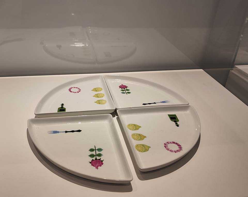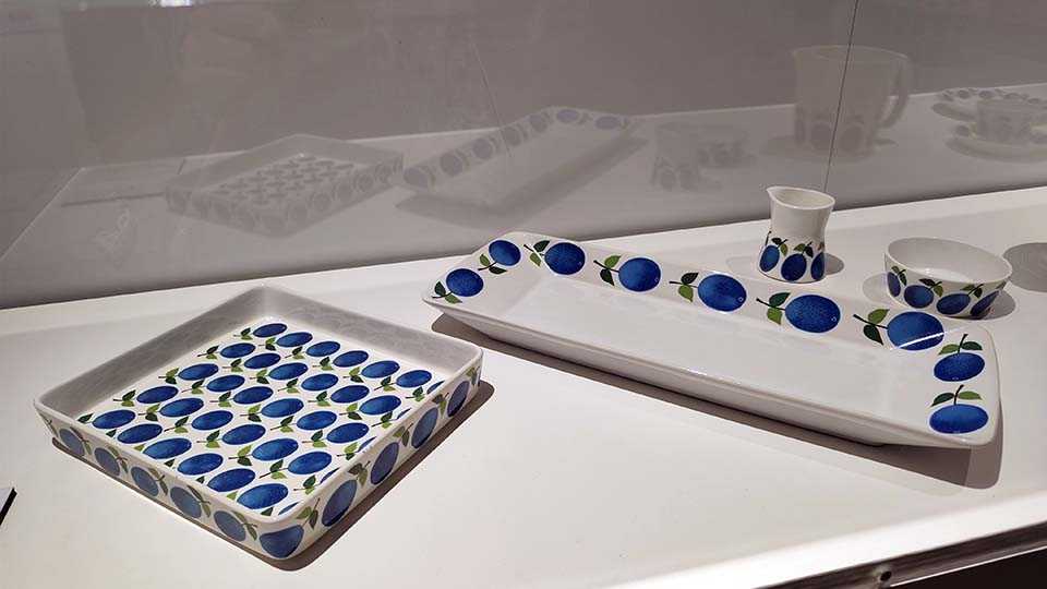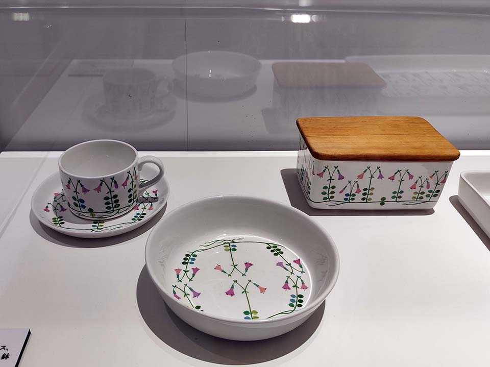 最初は代表作の食器を紹介。北欧デザインの食器は大ぶりに花や模様を書くことが特徴だが、リンドベリの作品もそれを踏襲している。