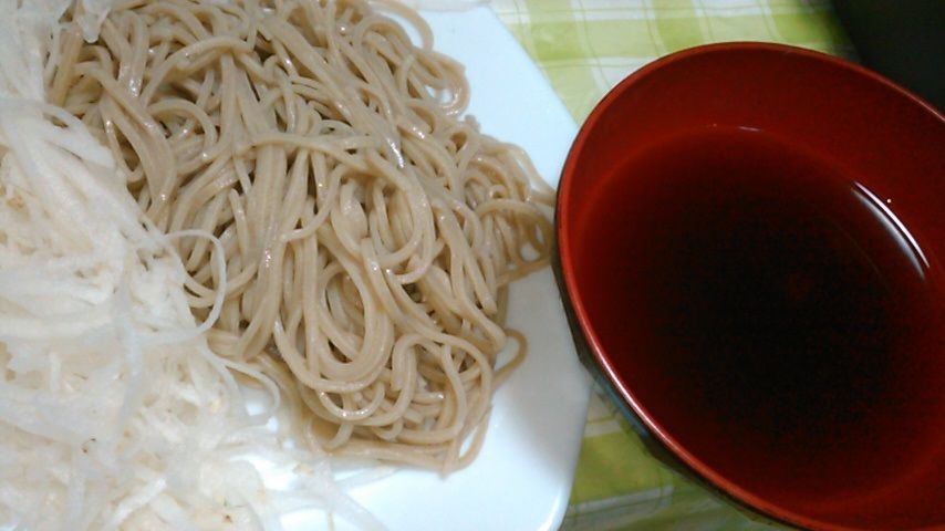 今日のランチは、昨日の春のそばまつりで求めたお土産用の手打ち生そば330gを2回に分けて茹でました。大根を千切り器で千切り大根と蕎麦を合わせていただきました。そばつゆは、創味のつゆをお湯割りで温かくしていただきました。やっぱり手打ち蕎麦はいいですね!蕎麦の厚さは1.5mmです。切り巾も1.5mm位です。この位、細く切れるようになるといいですね。目標ですがあと半年以上要すでしょうね。