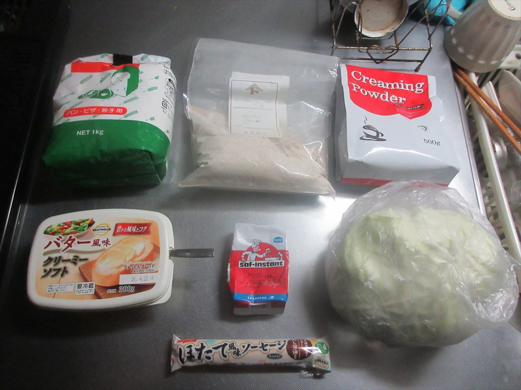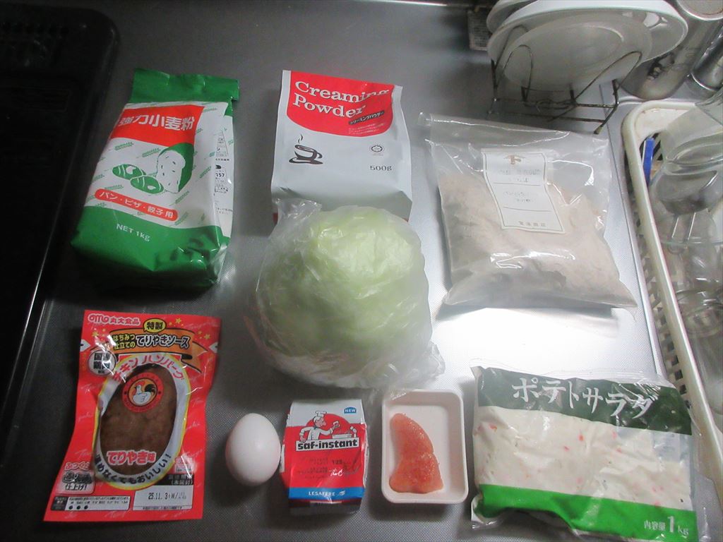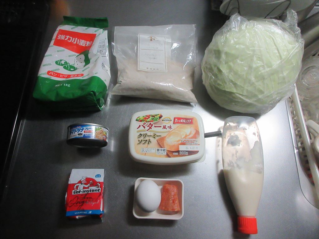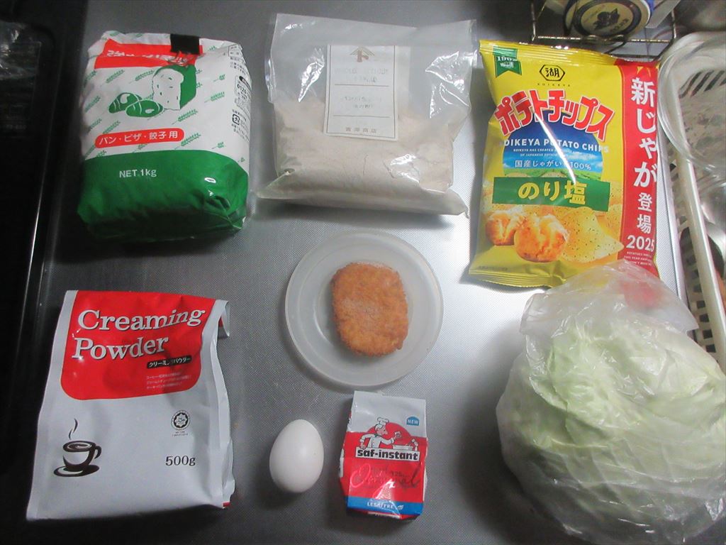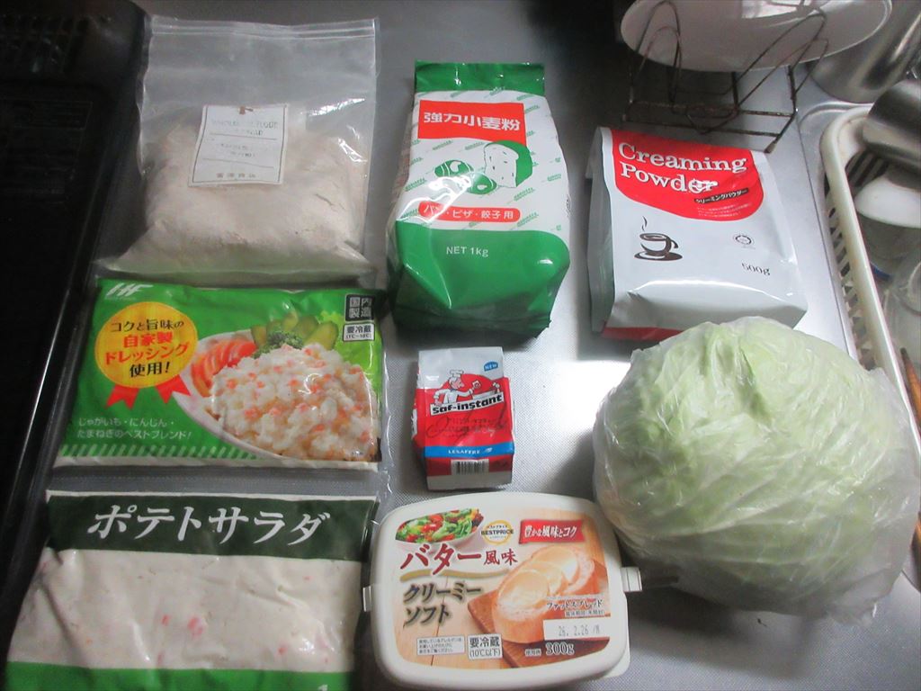 本日、平日休み 九月も後半に入り幾らか暑さも和らぎ清々しい・・・朝 そんな本日もこれらの食材達で Let's cooking! まずは ドライイースト1gと砂糖4.5gをぬるま湯60gに入れ 予備発酵イースト作り お次はボウルに 強力粉75g、全粒粉25g、塩、クリーミーパウダー 予備発酵イーストを流し入れ 混ぜ混ぜ 混ぜ混ぜし粉っぽい所が無くなったら 台に移し・・・バター風を加え・・・捏ね捏ね6分 表面がつるんとしたら 一次発酵開始・終了後 生地君が成長してくれたので 台に移し・・・三分割にし 濡れ布巾を掛けベンチタイム10分後 生地を成形し 二次発酵開始・終了後 生地に牛乳を塗り塗し 200℃で予熱したオーブンで180℃で15分焼き焼き すると 焼き上がりは・・・なんか・・・貧そ・・・(^^; これを冷ましている間に 卵サラダを作り マヨキャベポテチを作り まずは 麒麟淡麗生で乾杯! 平日休みの午前中早くから自宅で飲む麒麟淡麗生マジ、格別ですね♪ 出来上がったおつまみ達は これ 「コロッケコッペ」に 「マヨキャベポテチコッペ」と 「卵コッペ」 そのお味は うん、うん うん、うん うん、うん どれも・・・旨いんだな♪ だ・か・ら 「まる」の冷飲み始めちゃうんだな(^^; では、では
