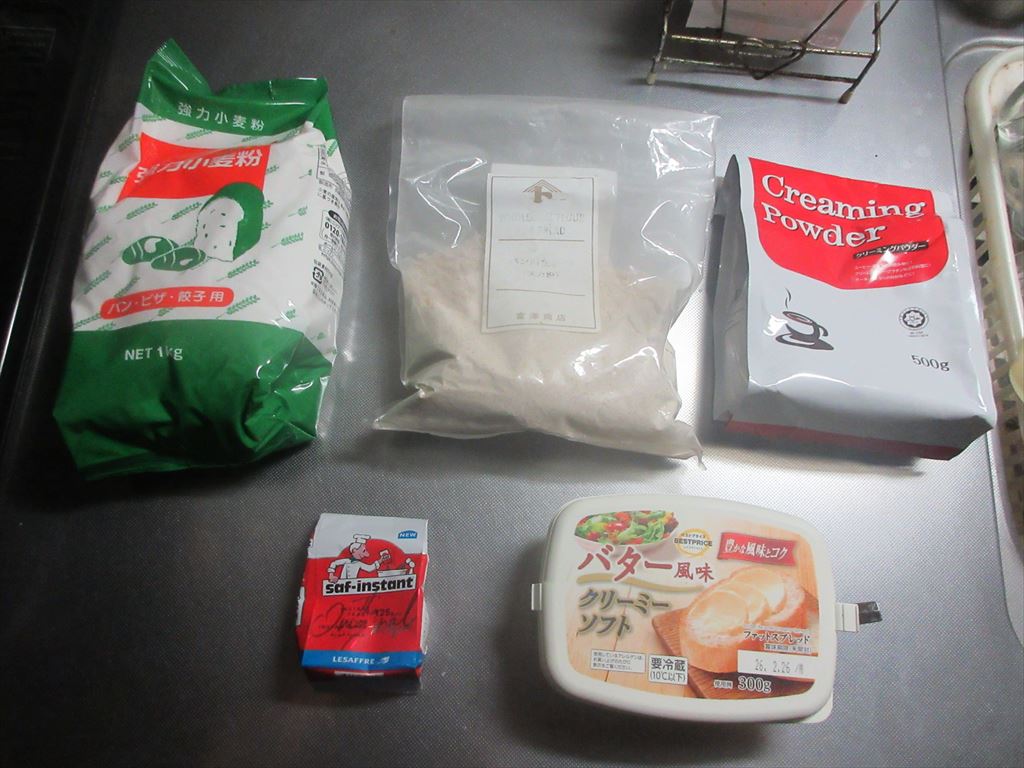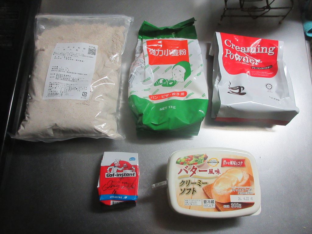 本日、週末休み でもね朝から・・・小雨 この後お友達との麻雀が控えているので これらの食材達で ささっとLet's cooking! まずは ドライイースト2.5gと砂糖5gをぬるま湯100gに入れ 予備発酵イースト作り お次はタッパに 強力粉225g、全粒粉25g、塩、クリーミーパウダー、ぬるま湯 予備発酵イーストを流し入れ カードで混ぜ混ぜ 混ぜ混ぜし粉っぽい所が無くなったら 台に移し・・・捏ね捏ね6分 バター風を加え・・・捏ね捏ね6分 表面がつるんとしたら 一次発酵開始・終了後 生地君が成長してくれたので 台に移し・・・丸め直し 濡れ布巾を掛けベンチタイム10分後 生地を成形し型に入れ 二次発酵開始・終了後 再び生地君が成長してくれたので 220℃で予熱したオーブンで200℃27分焼き焼き すると まーまーですかね・・・ で先程も申し上げた通りこの後10:00よりお友達との麻雀 だ・か・ら 麒麟淡麗生もまるのお預け・・・なんだな(^^; では、では